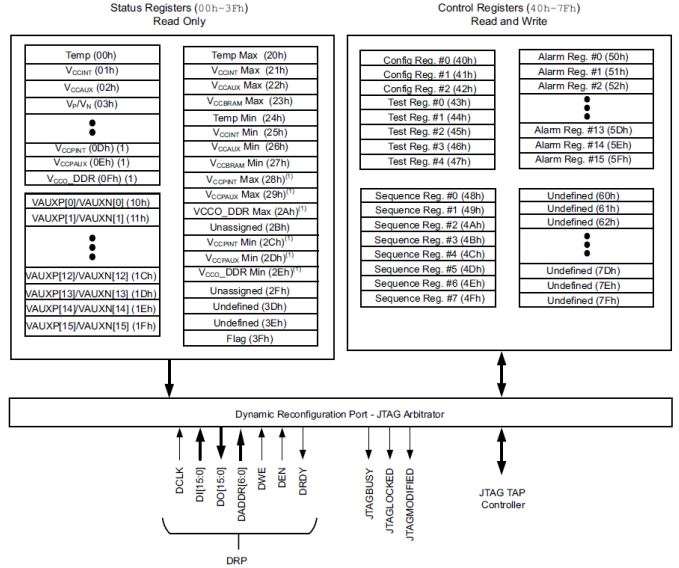 XADC内部包括16位的控制寄存器和状态寄存器,控制寄存器可以通过DRP(DynamicReconfiguration Port)进行读写操作,从而实现对XADC的初始化配置,而状态寄存器只能进行读取,ADC将采样转换后的值保存在对应的状态寄存器,通过DRP便可以将其读出,从而便可以用于FPGA外部的使用。
