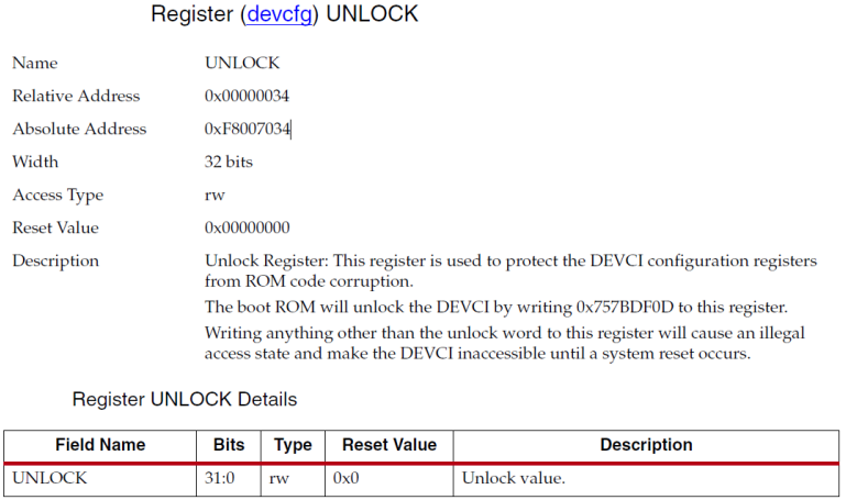 我们看下ug585这个寄存器的说明,大概意思是该寄存器用于保护DEVCI配置寄存器免受ROM代码损坏。说明这个寄存器配置还是很重要的,那么在代码启动完成后,需要UNLOCK。写入0X757BDF0D可以解锁。