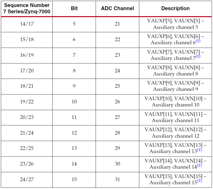上图为XADC的一个内部实现框图,从图中可以看出ADC分为12位的A和B两个,故称为双12位。其中ADC A可以对供电电压进行采样,供电电压包括VCCINT、VCCAUX、VCCBRAM,其中Zynq-7000系列的芯片还支持对VCCPINT、VCCPAUX和VCCO_DDR的采样,还包括温度的采样和外部模拟输入的采样。ADC B只能对外部模拟输入进行采样转换。