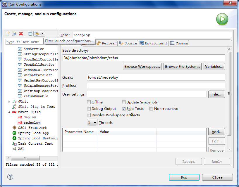 在项目目录下,进入CMD命令窗口,使用 mvn clean 首先进行清理工作,如果是第一次部署的话,使用命令 mvn tomcat7:deploy -Dmaven.test.skip=true -e进行部署(后面的参数代表跳过测试环节 -e将全部的日志信息打印出来),但是如果第二次部署的话,使用命令mvn tomcat7:redeploy -Dmaven.test.skip=true -e进行部署。