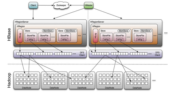 可以看到,client访问hbase上数据的过程并不需要master参与(寻址访问zookeeper和region server,数据读写访问regione server),master仅仅维护者table和region的元数据信息,负载很低。