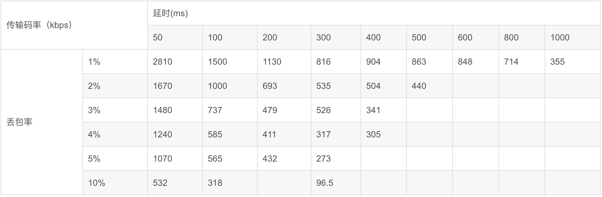 丢表率从1%-10%变化,延时从10ms变化到1000ms,测试每一个组合下的传输速率。当延时/丢包率增大时,传输速率会下降,当传输速率低于500kbps时,不再继续增大延时/丢包率。下表为测试结果: