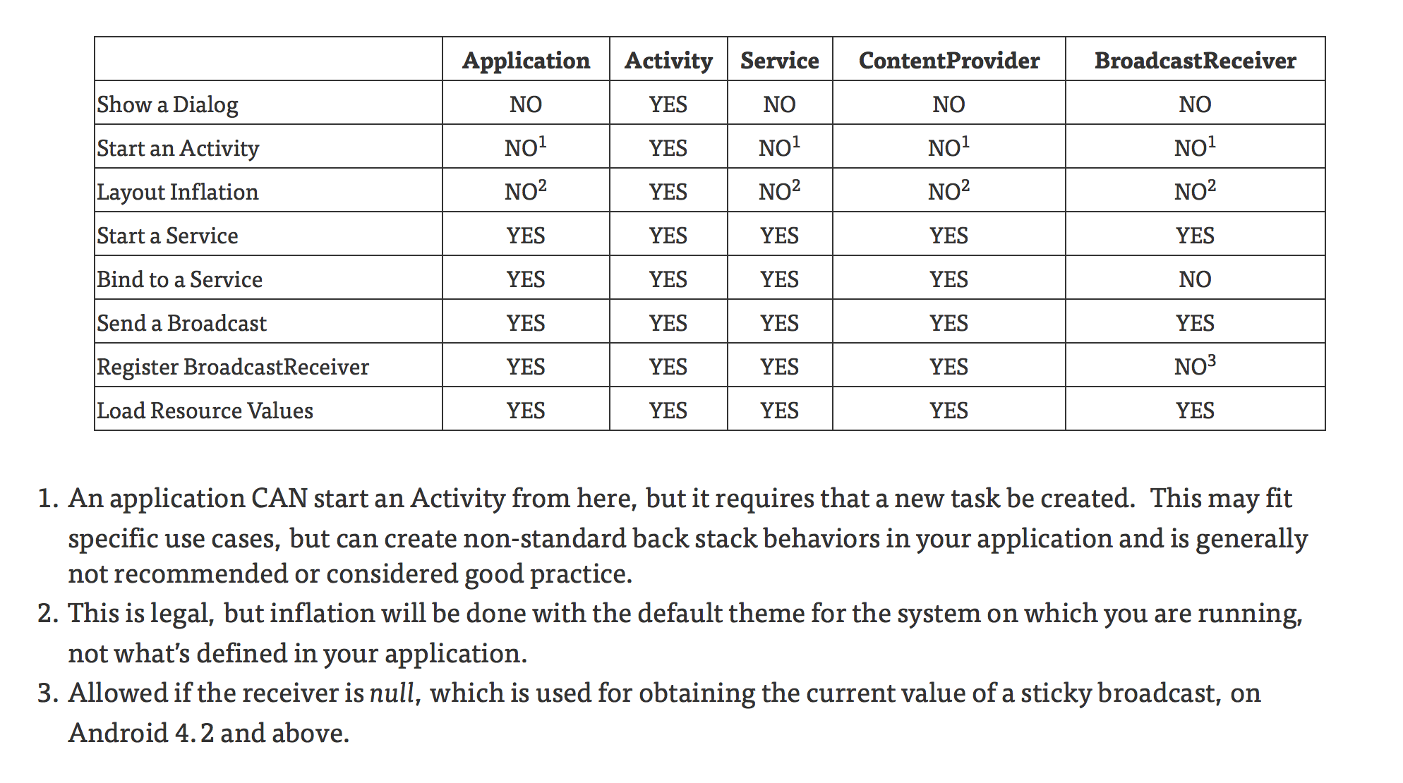 +----------------------------+-------------+----------+---------+-----------------+-------------------+ | | Application | Activity | Service | ContentProvider | BroadcastReceiver | +----------------------------+-------------+----------+---------+-----------------+-------------------+ | Show a Dialog | NO | YES | NO | NO | NO | | Start an Activity | NO¹ | YES | NO¹ | NO¹ | NO¹ | | Layout Inflation | NO² | YES | NO² | NO² | NO² | | Start a Service | YES | YES | YES | YES | YES | | Bind to a Service | YES | YES | YES | YES | NO | | Send a Broadcast | YES | YES | YES | YES | YES | | Register BroadcastReceiver | YES | YES | YES | YES | NO³ | | Load Resource Values | YES | YES | YES | YES | YES | +----------------------------+-------------+----------+---------+-----------------+-------------------+