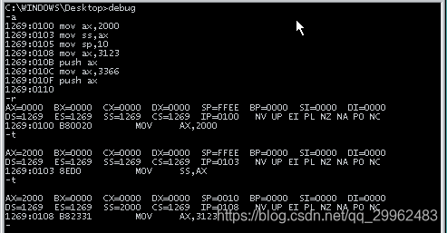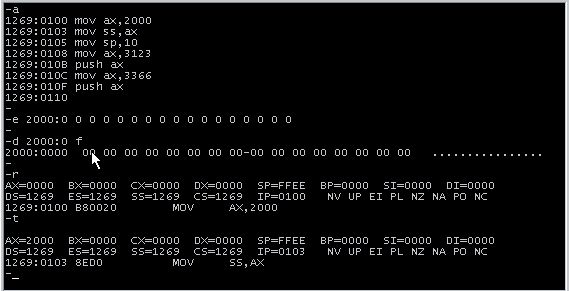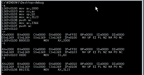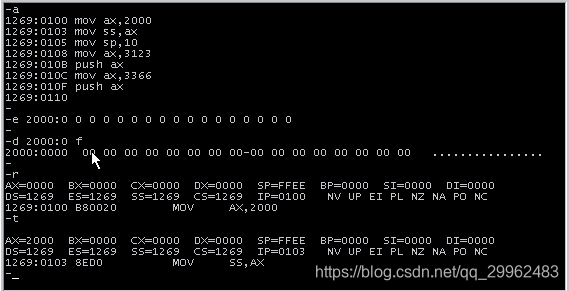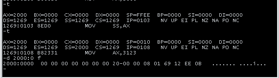 注意,再用T命令单步执行mov ss,ax前,ss=0b39,sp=ffee,而执行后ss=2000,sp=0010.