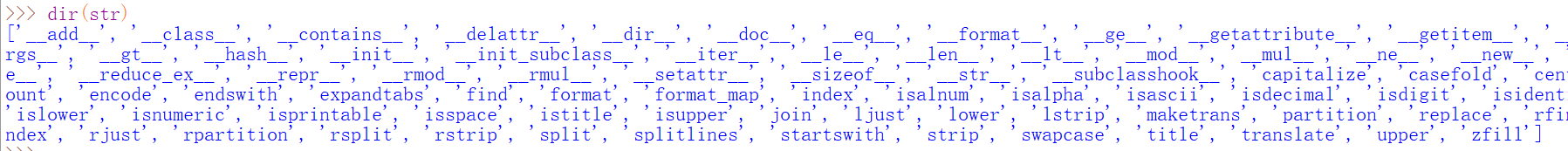 当然,还有很多的字符串处理方法,就类似于C++容器中的函数一样,如果需要查看字符串中有哪些处理方法,可以使用dirt(str)来查看所有的方法: