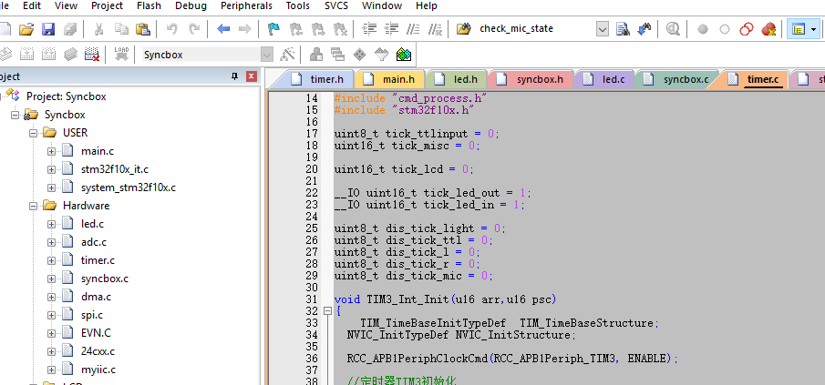 8、问题:在使用MDK 查看公司的老项目的STM32的工程文件,将产品开箱,利用SWD的方式将程序下载到产品中,发现并不会出现该有的现象,后来发现在如下图所示的位置中,可以选择为不同的工程,之前下载的工程为SynboxMini,而应该下载的工程为Synbox。