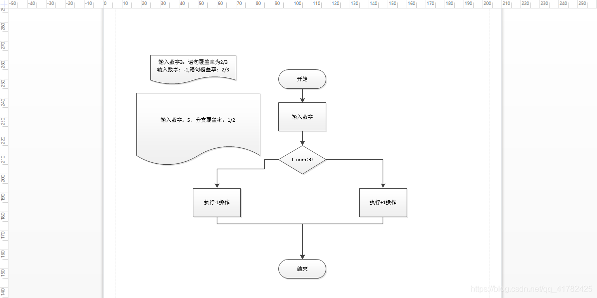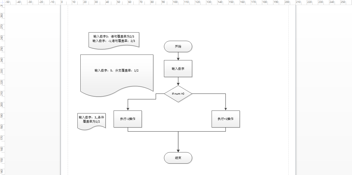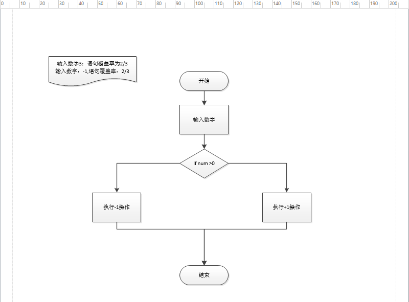 - 从流程图中开始到结束,通过语句覆盖率的计算方式,那么当给定一个数字3时,来计算语句覆盖率,需要注意的是语句表示的是非分支和非判断,所以在流程图中一共有3个语句分别是输入数字丶执行-1操作丶执行+1操作,即输入3时语句覆盖率为2/3,同理输入-1时也是一样的