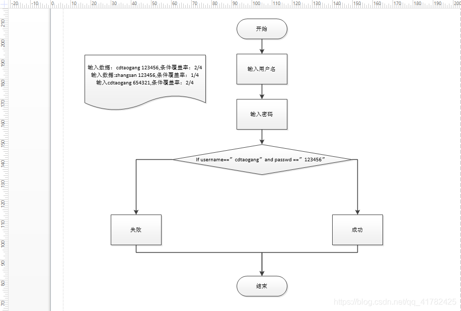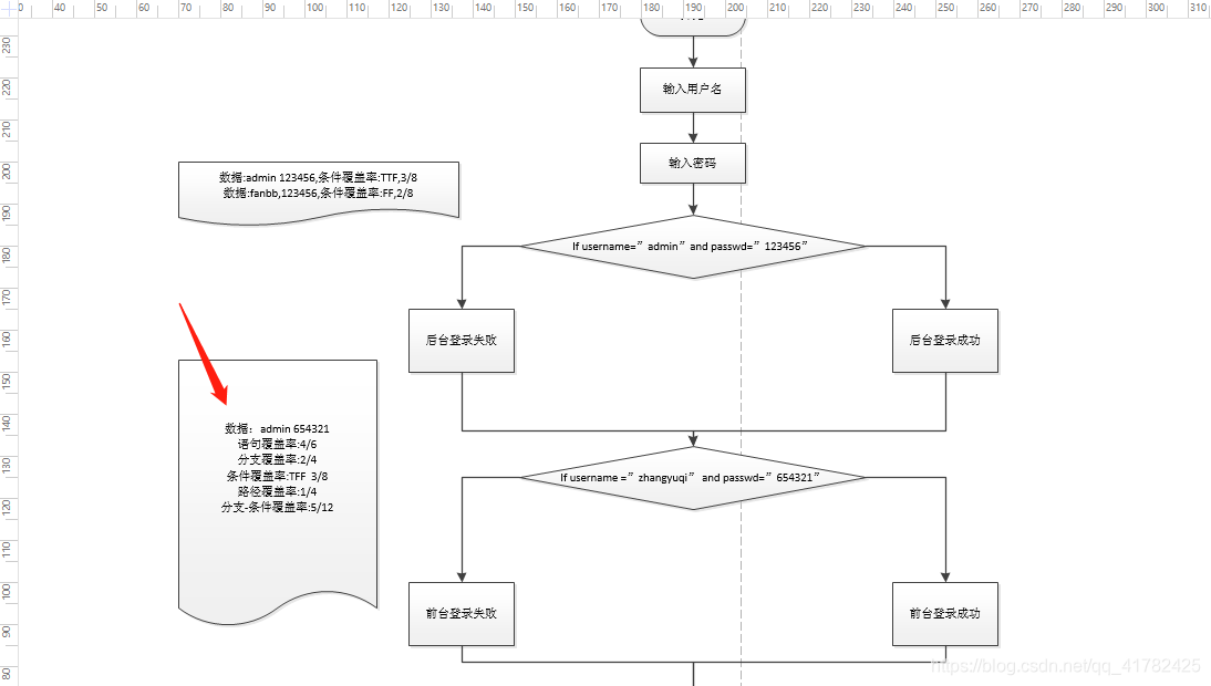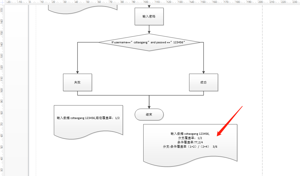 - 当输入正确的用户名和密码时,那么条件覆盖率为2/4,因为会进行两次判断;当输入错误的用户名和正确密码时,那么条件覆盖率为1/4,因为当用户名错误时就不会进行密码的判断,所以只有1次判断;当输入正确用户名和错误密码时,那么条件覆盖率为2/4,因为用户名正确就会继续判断密码所以是两次