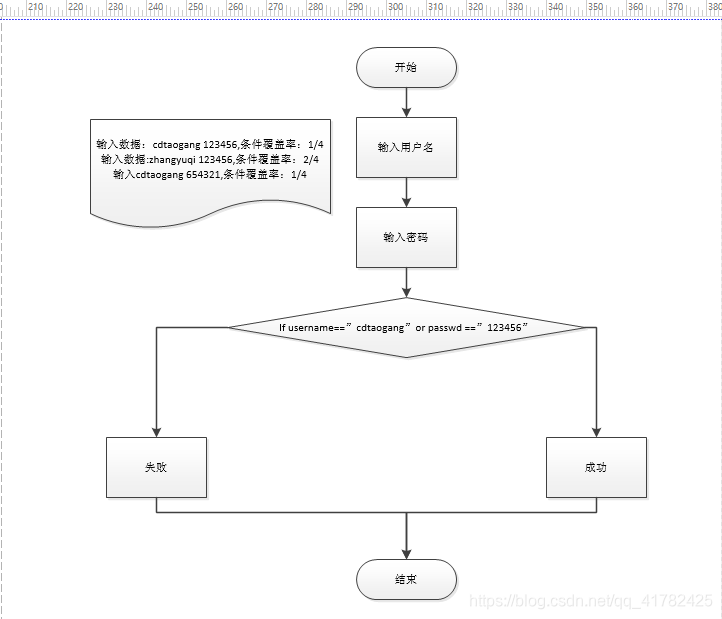 - 如果将if判断条件中的and改为or之后,那么就是用户名或密码只有有一个正确,则满足条件登录成功;所以第一种输入数据的条件覆盖率为1/4,第二种为2/4,因为用户名不正确判断第一次,接着判断密码,一共两次,所以条件覆盖率为2/4;最后一种输入数据条件覆盖率为1/4