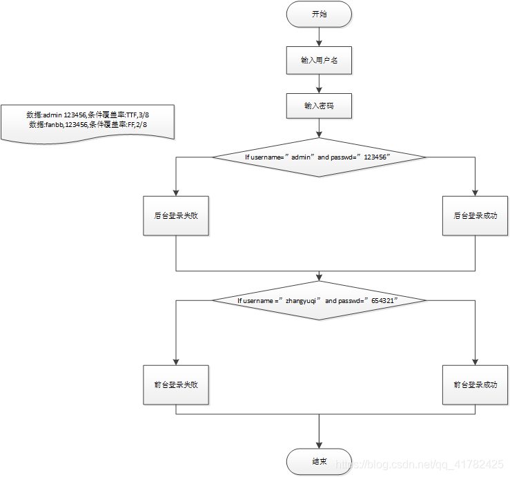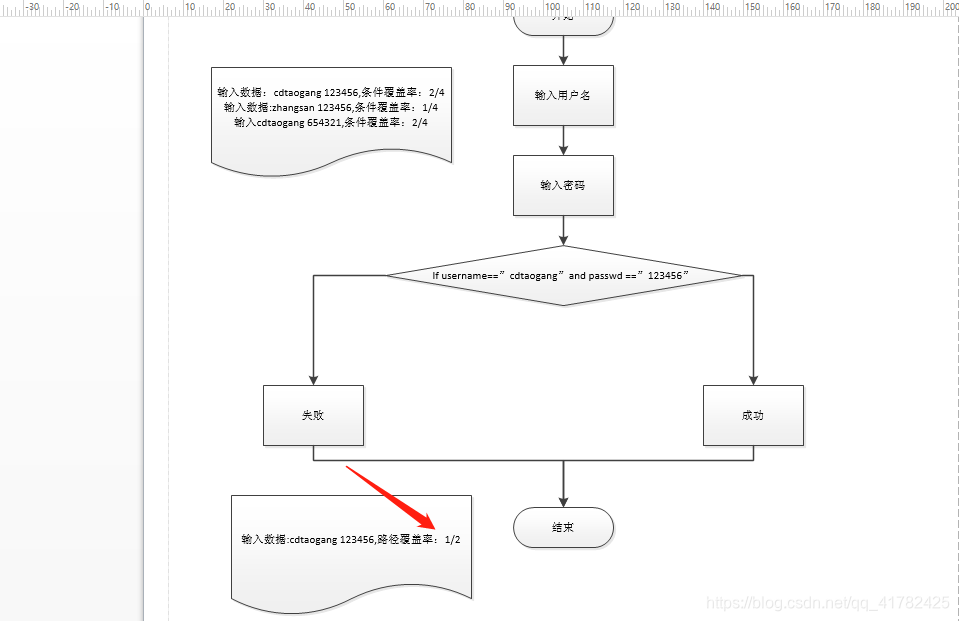 - 在案例1中输入用户名和密码为正确的,其路径覆盖率为1/2,全部路径数为2,也就是从开始——失败——结束和开始——成功——结束,输入正确的用户名密码则被测路径数为1,所以为1/2