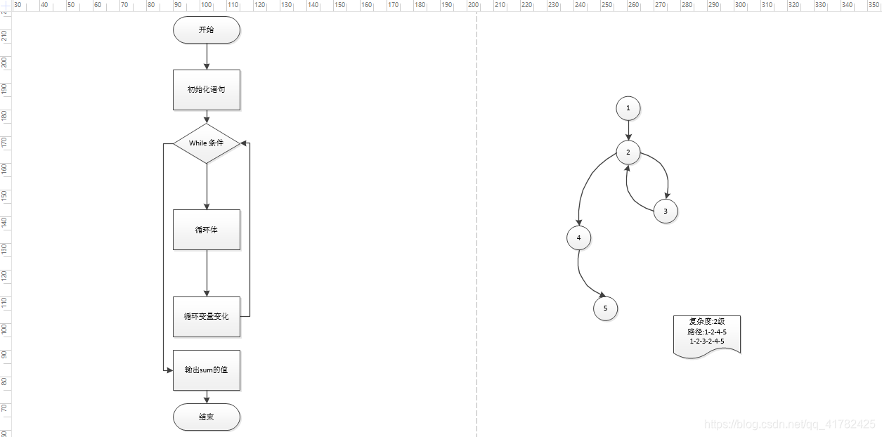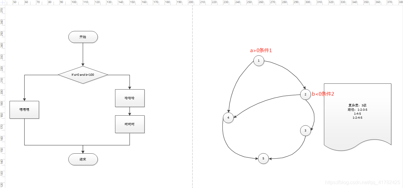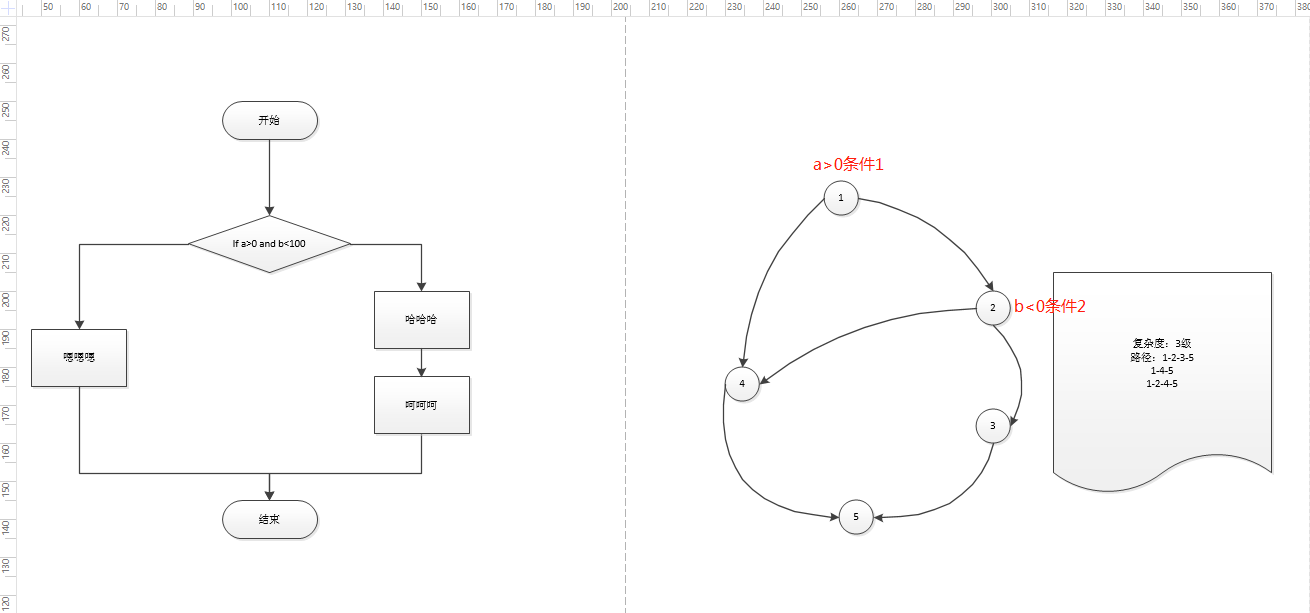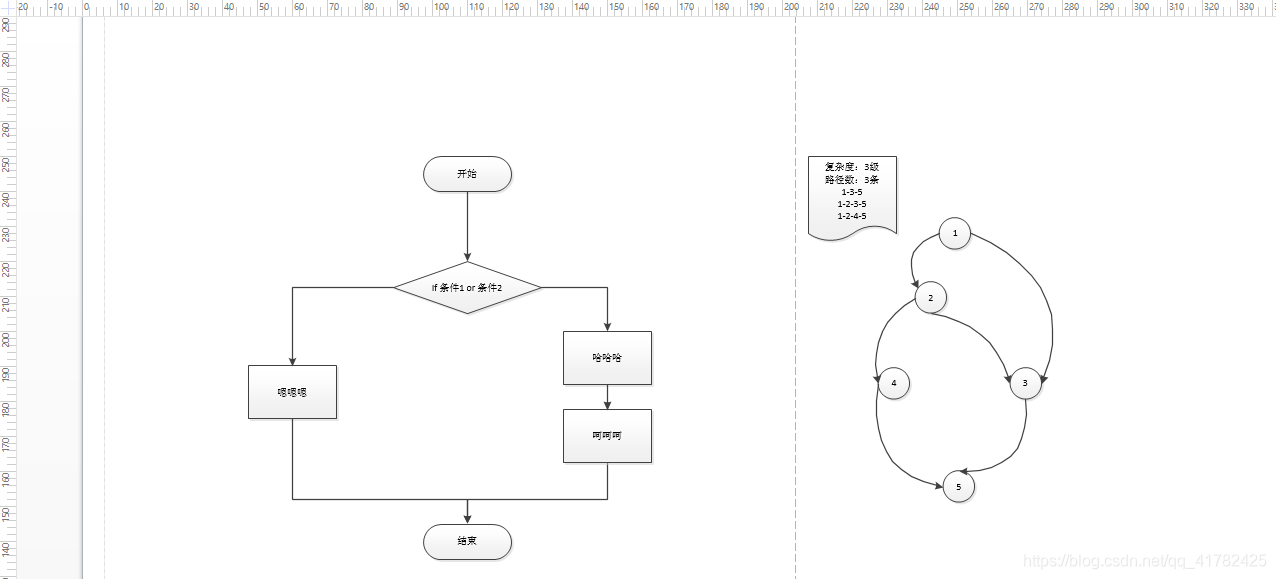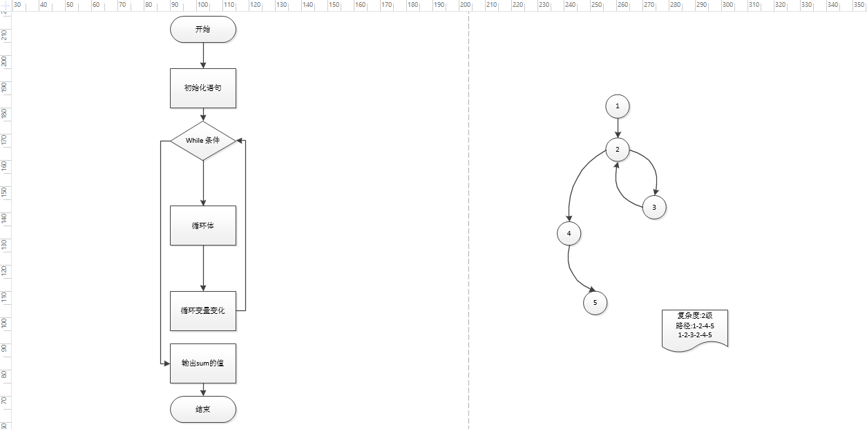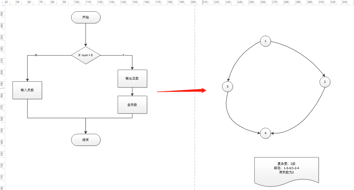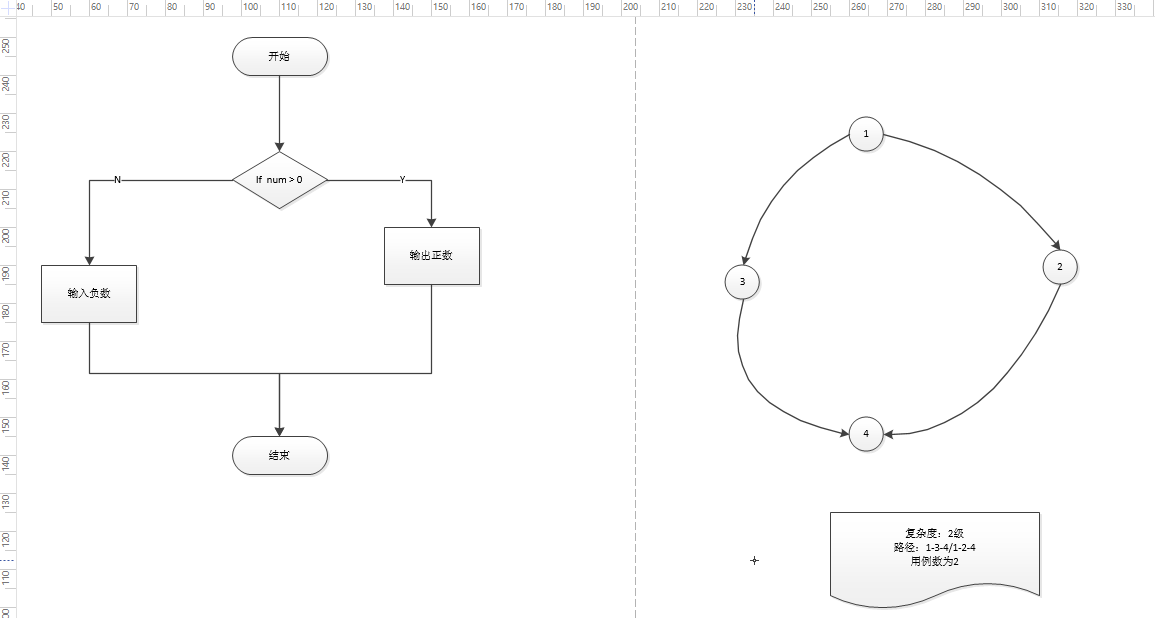 路径的个数描述的就是复杂度的级别(所以上面的流图的路径为2,即复杂度为2)