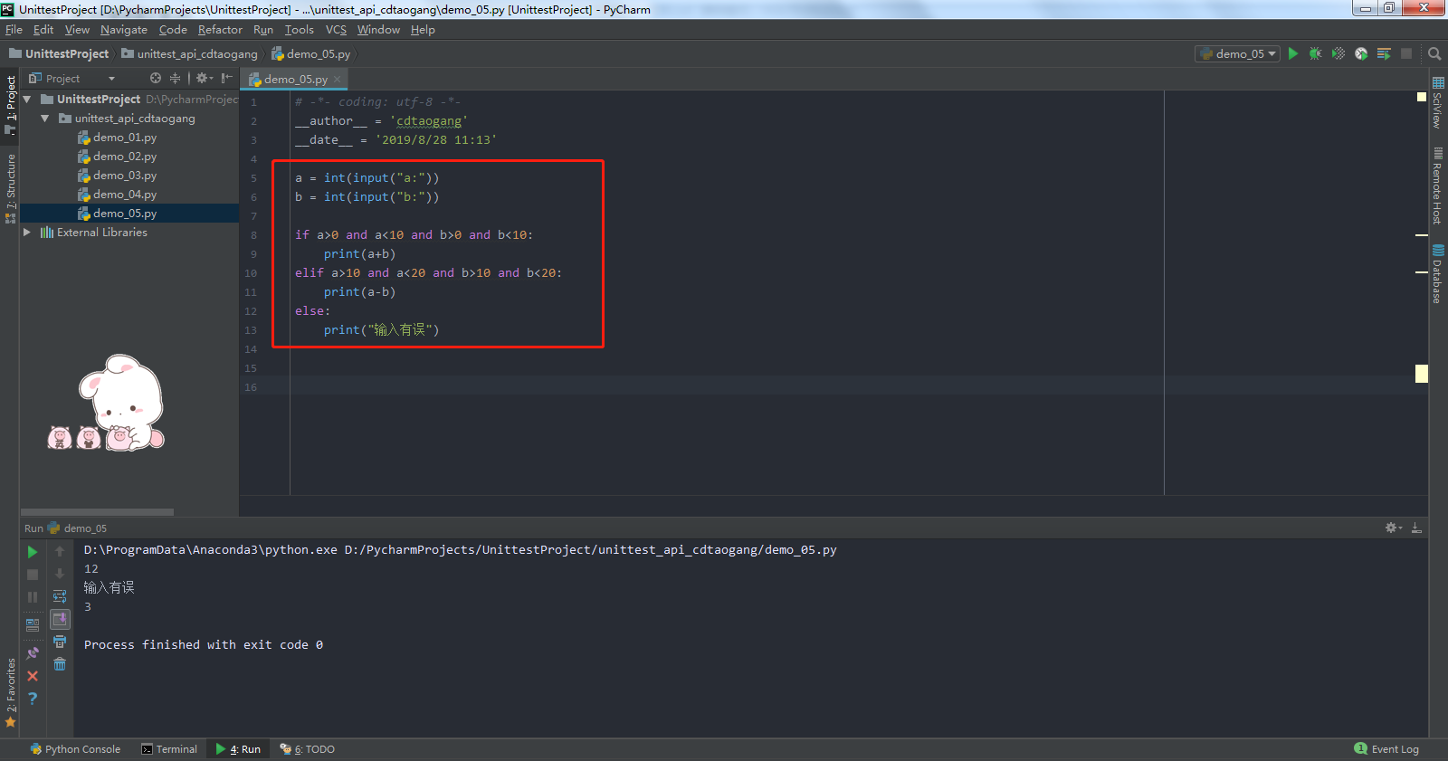 - 示例6:根据需求编写代码,输入数字两个,对其进行判断,如果同时在0-10之间,对其两个数字进行求和,如果同时在10-20之间进行求差,其他为输出输入有误,代码如下
