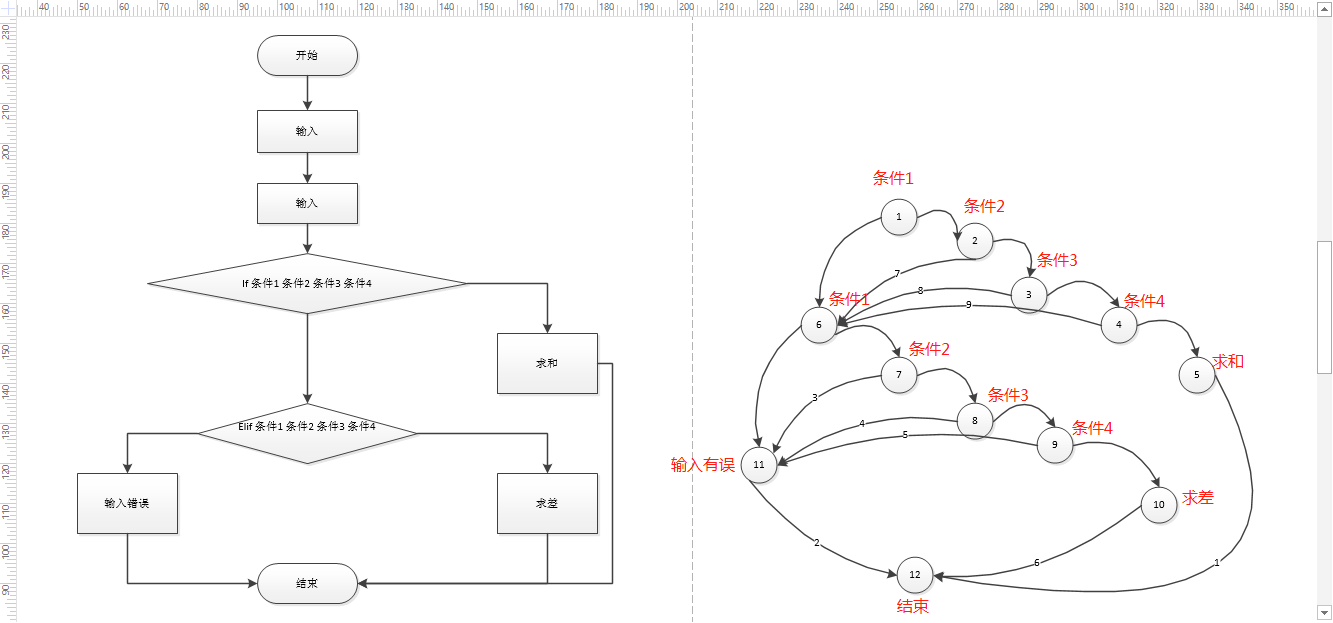 - 即以上代码的流程图需要修改,但是流图与示例2的一致,因为首先都是在>0的条件下的语句并且圈的定义是:判定框中的条件或者一条或者多条语句,所以流图不变都是编号2里面