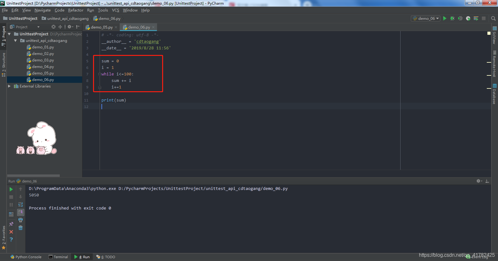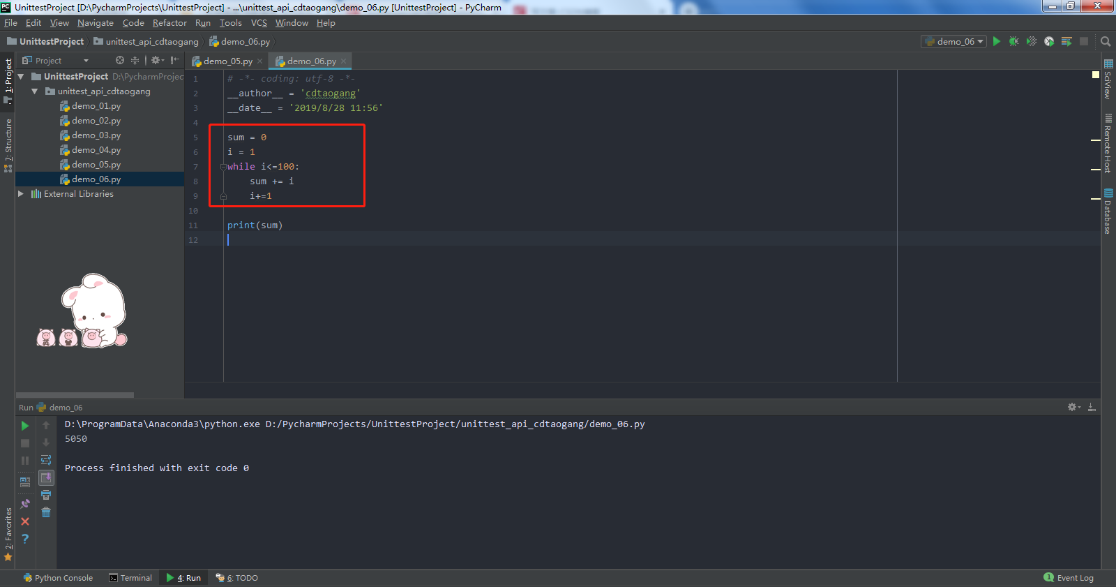 - 示例7:编写代码实现从1+2+...+100的和,需使用while循环,代码如下