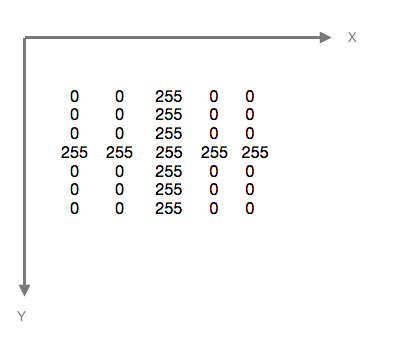 这是一张5*7大小的二值图,白色像素值为255,黑色像素值为0,我的目的是要求得(3,4)这个交点坐标。以求X坐标为例,先将每一列的值相加存入数组得到 [255, 255, 1785, 255, 255] ,可以看到出现了一个最大值1785,然后将相邻的列相减(从第二列开始,后一列减去前一列)的值存入另一个数组得到 [0,1530,-1530,0] ,可以看到出现了一个极大值和极小值,而这两个值对应的索引(列号)就是我们需要的值。取得极大值的索引:2; 极小值的索引: 3 。对应二值图可以看到,2就是我们需要求的X坐标的左邻列,3+1 就是X坐标的右邻列。最后求的 X = (2+4)/2 = 3 。同理,Y= (3 +5 )/2 = 4 。