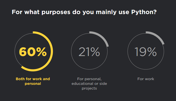 60%的受访者表示他们使用Python进行工作和个人使用。 21%专门用于个人,教育或辅助项目,19%用于工作。 58%的Python用户使用该语言进行数据分析,比去年增加了8%。 52%使用Python进行Web开发,43%的DevOps/系统管理使用Python。机器学习的使用也上升了7%,达到38%。通常,Python更多地用于数据分析应用程序,而不是Web开发。