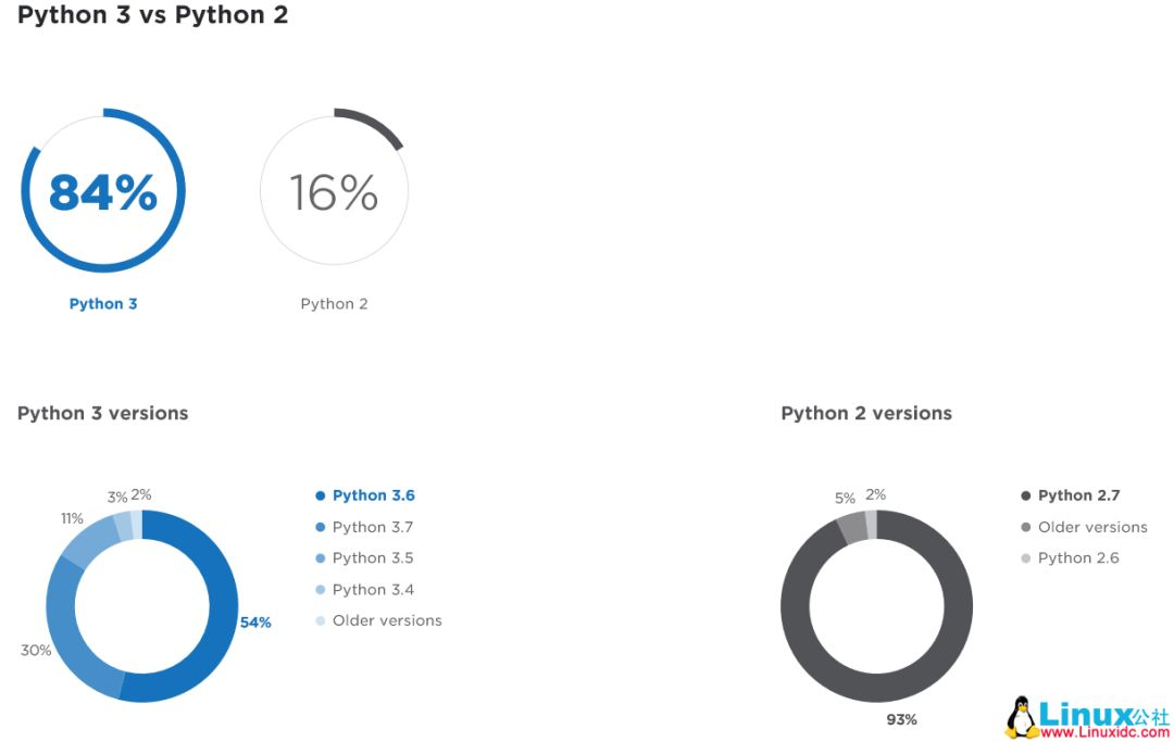 Python 3的采用率较高,为84%,而2017年为75%。Python 2占16%,明年将失去核心团队的支持。主要的库已经放弃了对Python 2的支持。