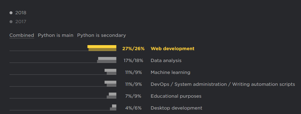 当只有一个可选时,Web开发是最受欢迎的答案,占27%。数据分析为17%,机器学习为11%。有趣的是,如果你考虑'数据科学'数据分析和机器学习结合起来考虑,那么大多数Python用户在这一领域的比例为28%。