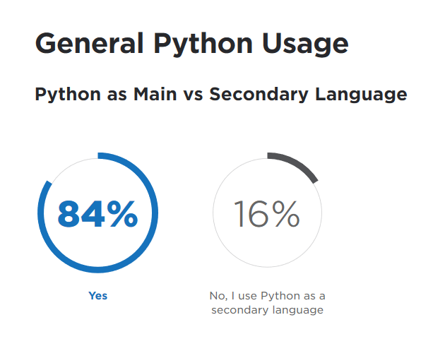 根据Python调查,84%的开发人员表示他们将其用作主要语言,而另外16%的开发人员将其用作次要语言。从2017年使用Python作为主要用户的79%的开发人员中可以看出这一点。大约50%的Python用户也使用JavaScript,而C/C++、Java和C#等其他语言。Python开发人员也越来越多地使用Bash/Shell。