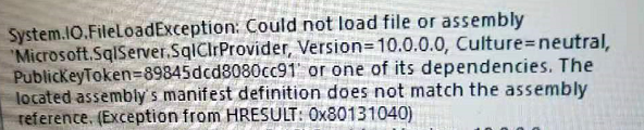 在本地开放调试好好的,但是软件安装到别的电脑就出现:could not load file or assembly Microsoft.SqlServer.SqlClrProvider, Version = 10.0.0.0