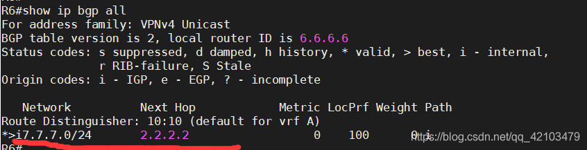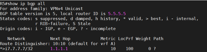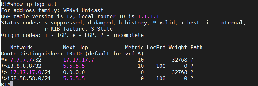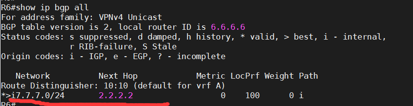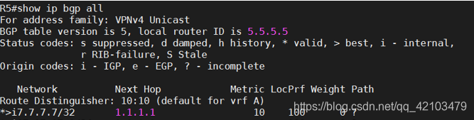 接下来在R1上看一下 show ip bgp all(如果使用静态路由无7.7.7.7那条,但是这个因为pe和ce使用的rip应该有7.7.7.7)