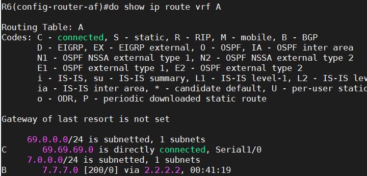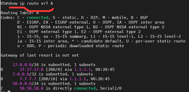 经过以上操作,在R1上已经可以看到R7总部的路由,在R1上用show ip route vrf A查看