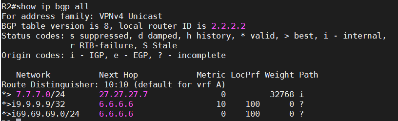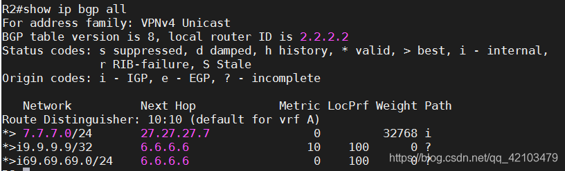 此时在R2上已经能够看到总部R7上的路由: show ip bgp all