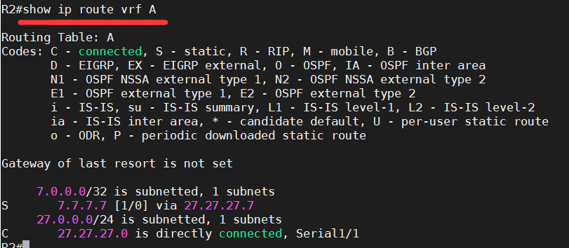 R2(config)#ip route vrf A 7.7.7.0 255.255.255.0 27.27.27.7