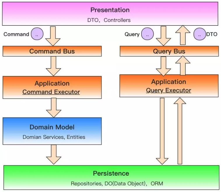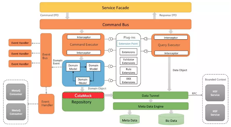 换一个视角,从COLA应用处理响应一个请求的过程来看。COLA使用了CQRS来分离命令和查询的职责,使用扩展点和元数据来提升应用的扩展性。整个处理流程如下图所示: