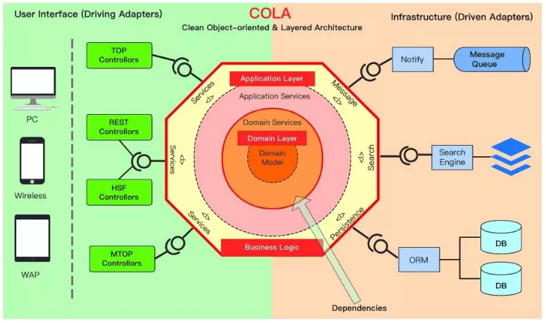 在架构思想上,COLA主张像六边形架构那样,使用端口-适配器去解耦技术细节;主张像洋葱圈架构那样,以领域为核心,并通过依赖倒置反转领域层的依赖方向。最终形成如下图所示的组件关系。