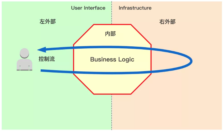 六边形架构又称为端口-适配器架构,这个名字更容器理解。六边形架构将系统分为内部(内部六边形)和外部,内部代表了应用的业务逻辑,外部代表应用的驱动逻辑、基础设施或其他应用。