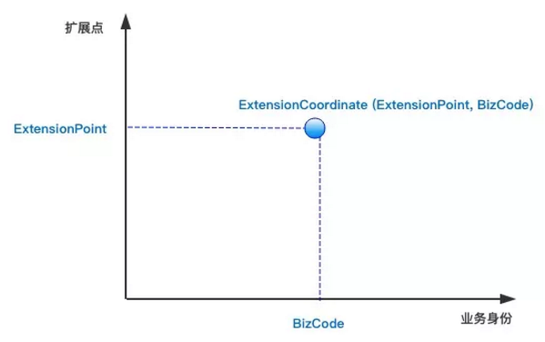 每个业务或者场景都可以实现一个或多个扩展点(ExtensionPoint),也就是说一个业务身份加上一个扩展点,可以唯一地确定一个扩展实现(Extension)。而这个业务身份和扩展点的组合,我们将其称之为扩展坐标(ExtensionCoordinate),如下图所示。