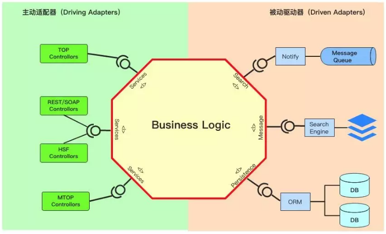 六边形架构是Alistair Cockburn在2005年提出,解决了传统的分层架构所带来的问题,实际上它也是一种分层架构,只不过不是上下,而是变成了内部和外部(如下图所示)。