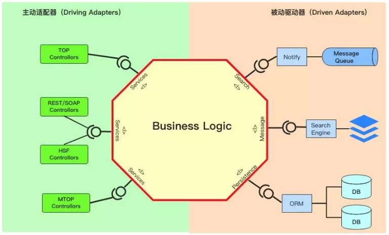 适配器分为两种类型(如下图所示),左侧代表 UI 的适配器被称为主动适配器(Driving Adapters),因为是它们发起了对应用的一些操作。而右侧表示和后端工具链接的适配器,被称为被动适配器(Driven Adapters),因为它们只会对主适配器的操作作出响应。