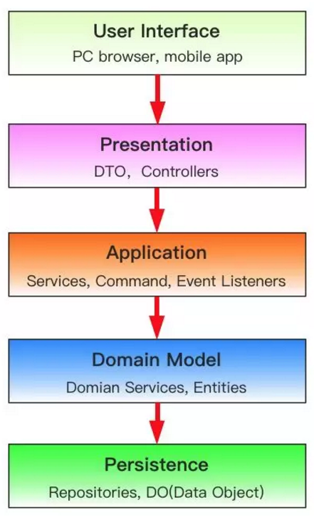 2)应用层(Application Layer):主要负责获取输入,组装上下文,做输入校验,调用领域层做业务处理,如果需要的话,发送消息通知。当然,层次是开放的,若有需要,应用层也可以直接访问基础实施层;