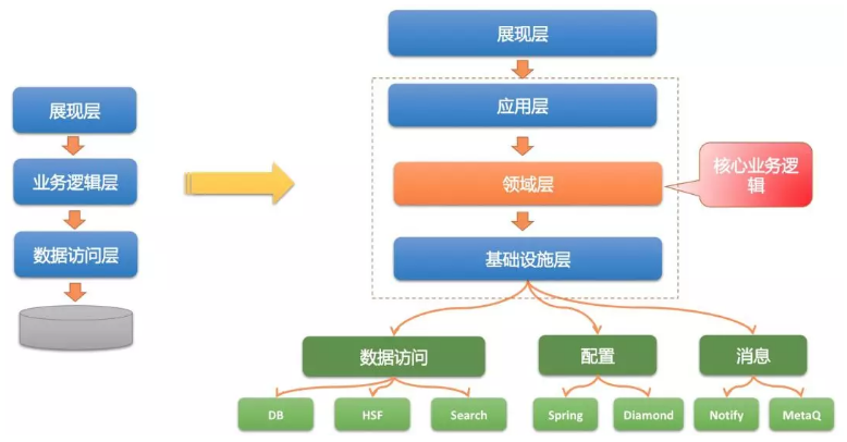 COLA的分层是一种改良了的三层架构。主要是将传统的业务逻辑层拆分成应用层、领域层和基础实施层。如下图所示,左边是传统的分层架构,右边是COLA的分层架构。