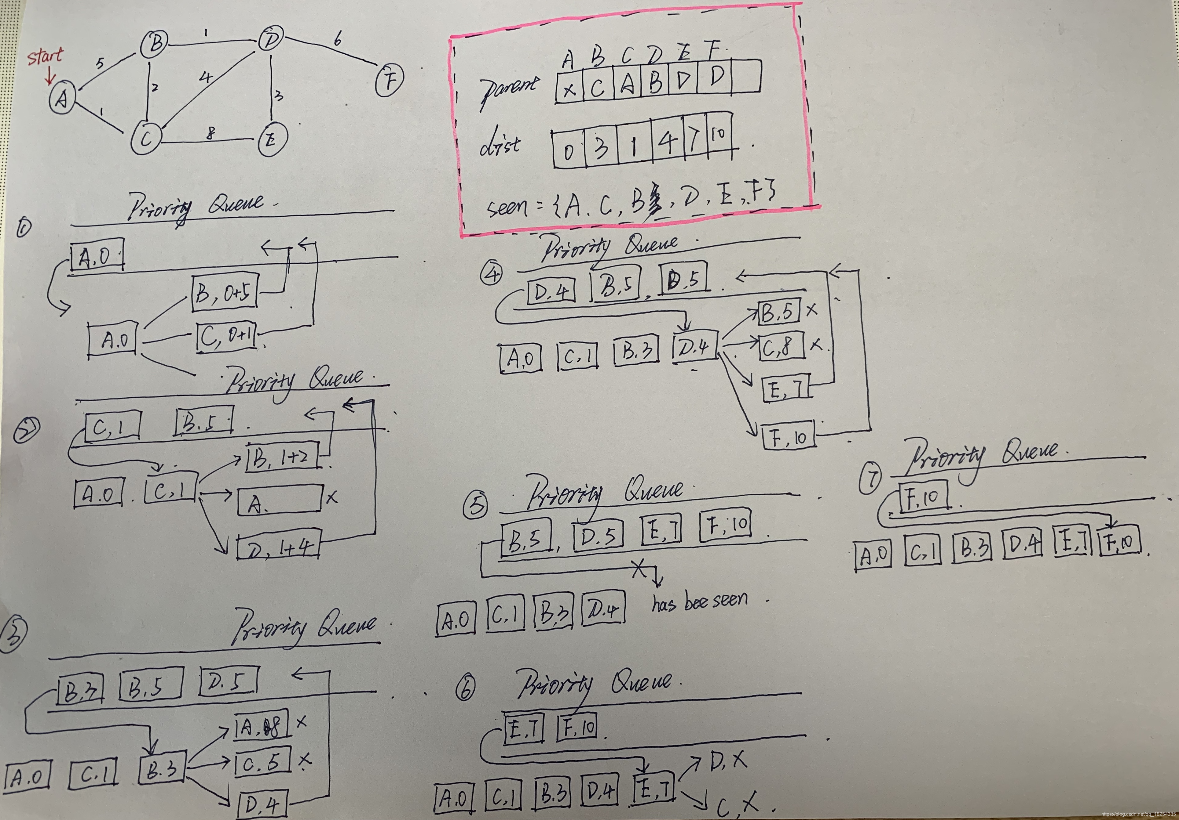 heapq.heappush(pqueue, (0, start)) # 优先队列入队元素(距离,节点)