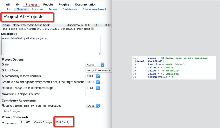 添加Verified标签支持,这里修改All-Project 项目的project.config,所有继承自All-Project的项目自动添加Verified 标签,也可针对项目自定义是否verify。