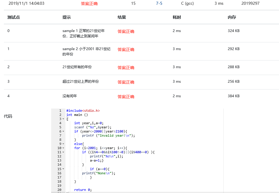 4.部分正确:在最后对于没有一个满足条件的年份的输出时没有加\n,后来在当中加一个\n