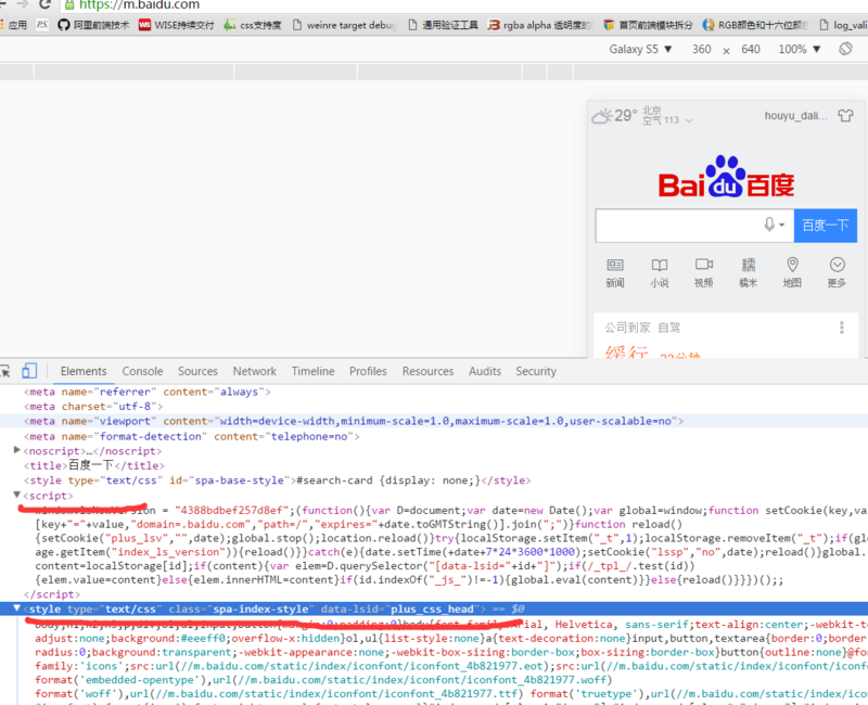为了求快,首页是没有js和css外链的,这样会再发起多次请求,相信对于各位前端小能手来说,也是老生常谈的前端优化了。所以,整个首页渲染出来,只需要一次请求(除了iconfont)。其他的首屏所需要的js与css,全部在上线前,编译时,编译内联至HTML中,如图3.1.1。