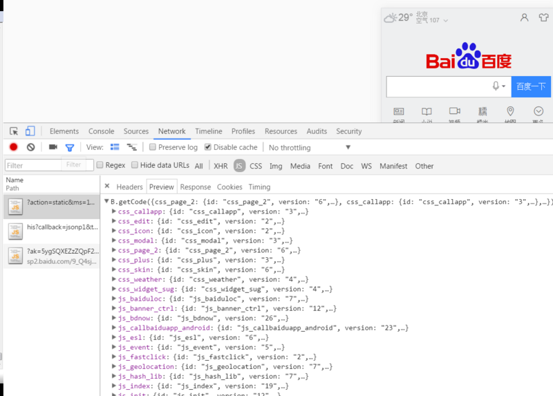 前端首屏加载完成后,会用这些版本号与local中进行一一对比,发现不一致的js/css,会一起发送一个合并请求。如图3.3.1所示。这样可以保证每个文件的缓存与版本迭代。同时,也避免了过多的外链。