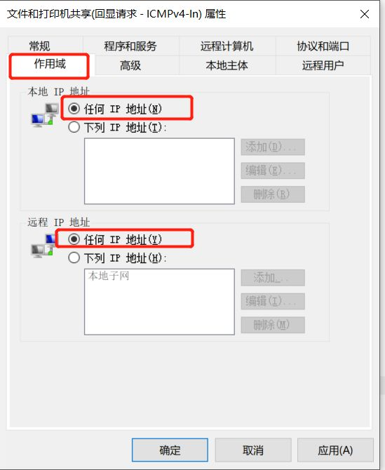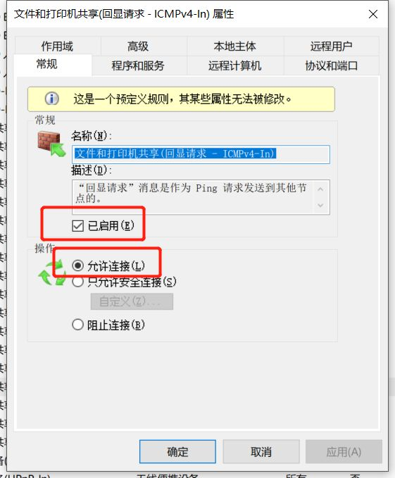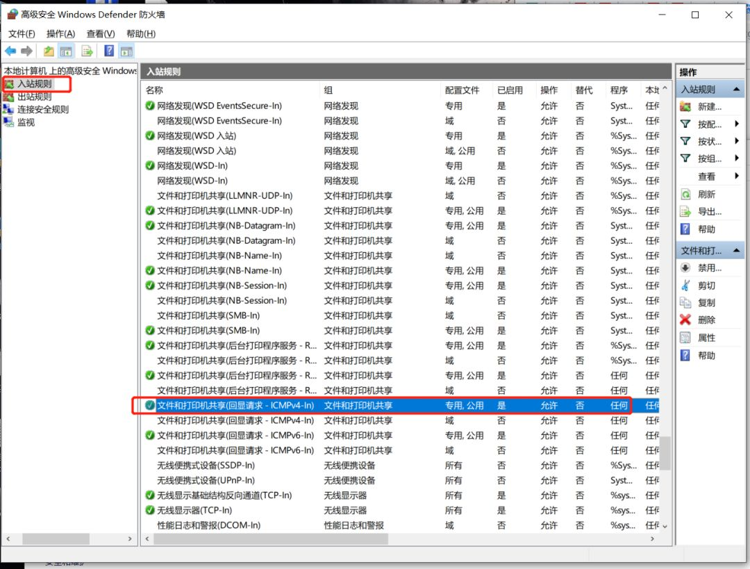 windows+R 输入control 进入控制面板->系统安全->Windows Defender 防火墙->高级设置->入站规则->文件和打印机共享(回显请求 - ICMPv4-In)