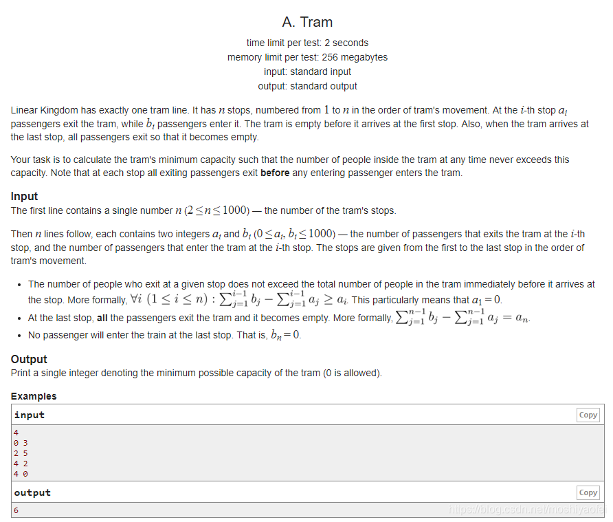 你的任务是计算电车的最小容量,使电车内的人数在任何时候都不会超过这个容量。 请注意,在每一站,所有离开的乘客在任何进入的乘客进入电车前离开。