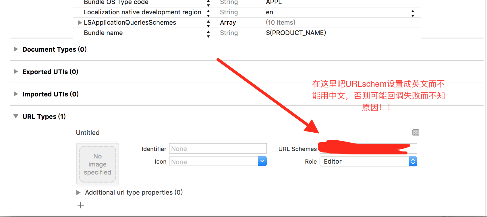 当我点击取消(红色箭头所指的叉),或者支付完成应该回到原来的界面。这是什么原因了?我明明设置了URLschem,为什么还是不行?后来我恍然大悟,是不是URLschem设置成了中文,后来我果然猜对了,URLschem不能设置成中文!!!改成英文的,URLschem在下图设置