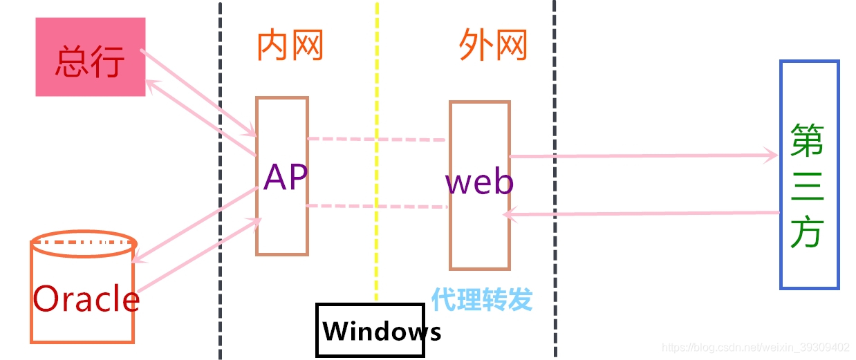 以上就是生产环境的机器配置(每一台机器的Ip我打了马赛克),项目流程如下图,其中AP是内网,WEB走外网,Windows是各分行公用,无上传下载通道,其上只有一个Ie浏览器可以登录WebLogic控制台: