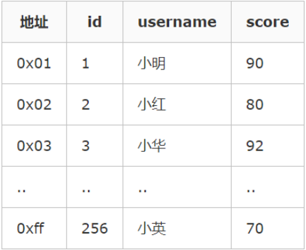 第一列的地址表示该行数据在磁盘中的物理地址,后面三列才是我们SQL里面用的表里的列,其中id是主键,建立了聚集索引。