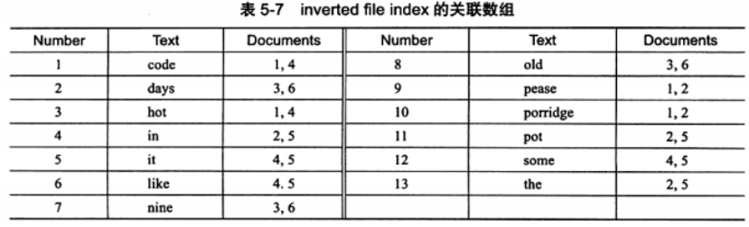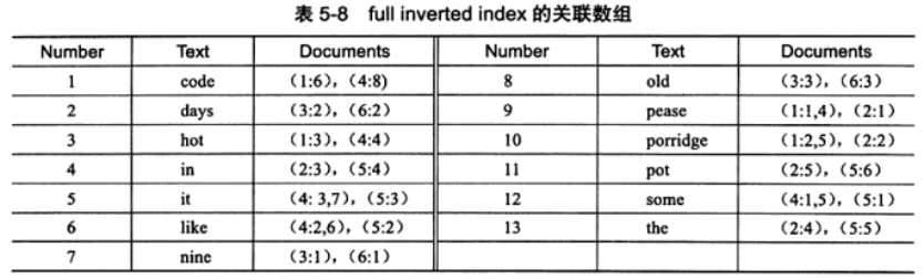 对于inverted file index的关联数组,其存储的内容如表5-7所示。