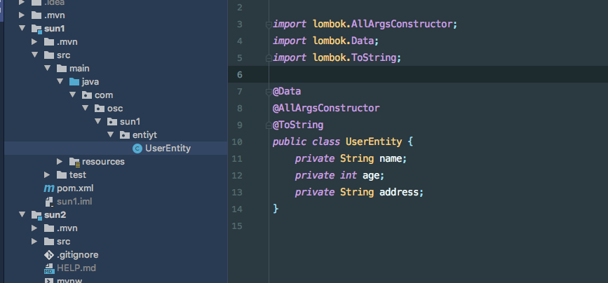 sun1项目上创建entity层,这个时候就可以使用lombok插件了,因为继承了父工程
