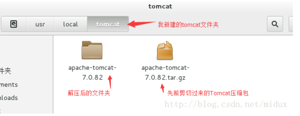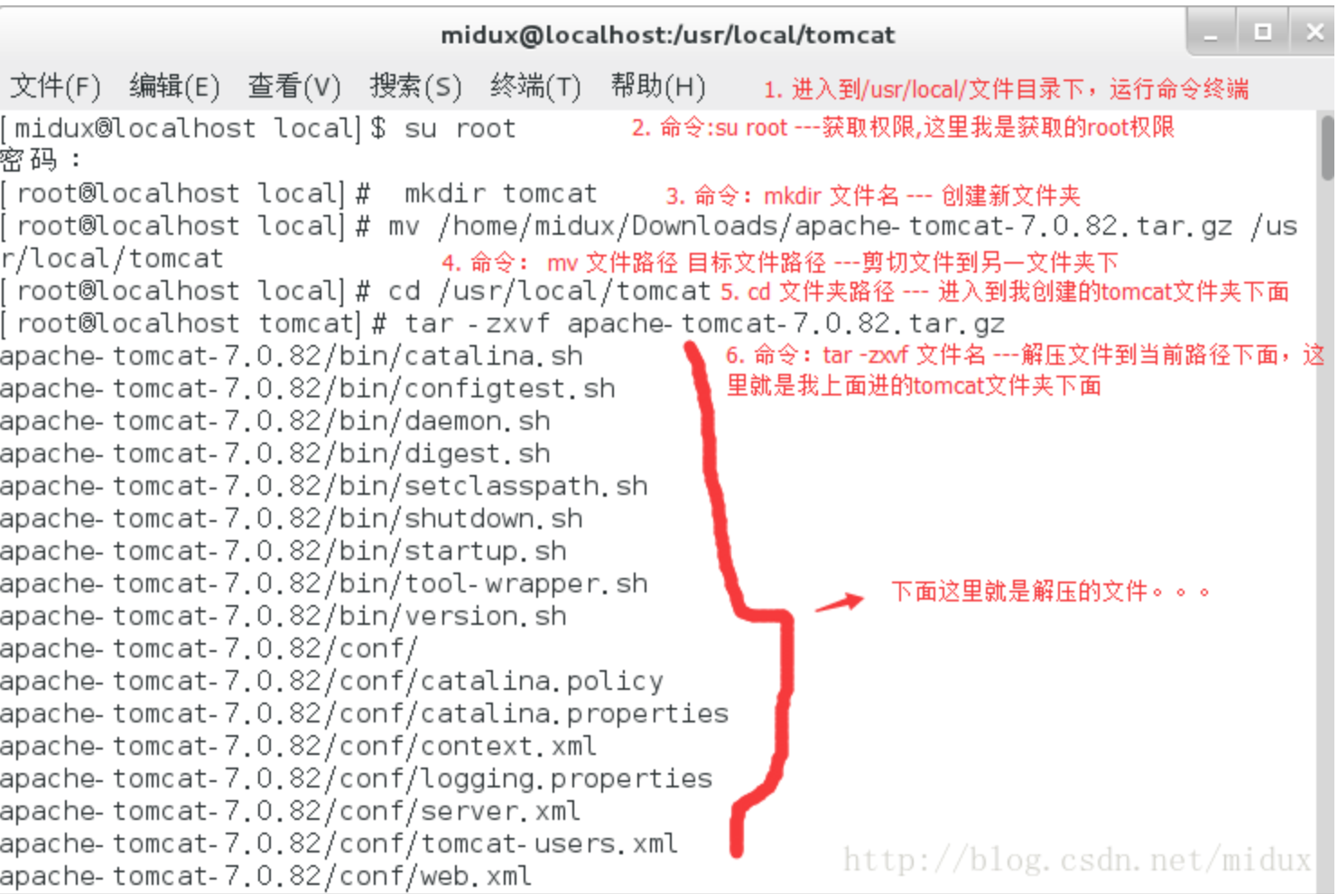 下载完成之后,可能系统会默认下载到downloads文件夹下面,一般我喜欢在usr/local/文件夹下面新建一个tomcat文件夹,然后将我下载的tomcat剪切到这个文件夹里面,再解压,命令行如下图: