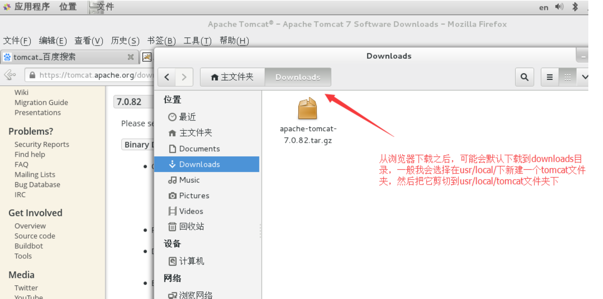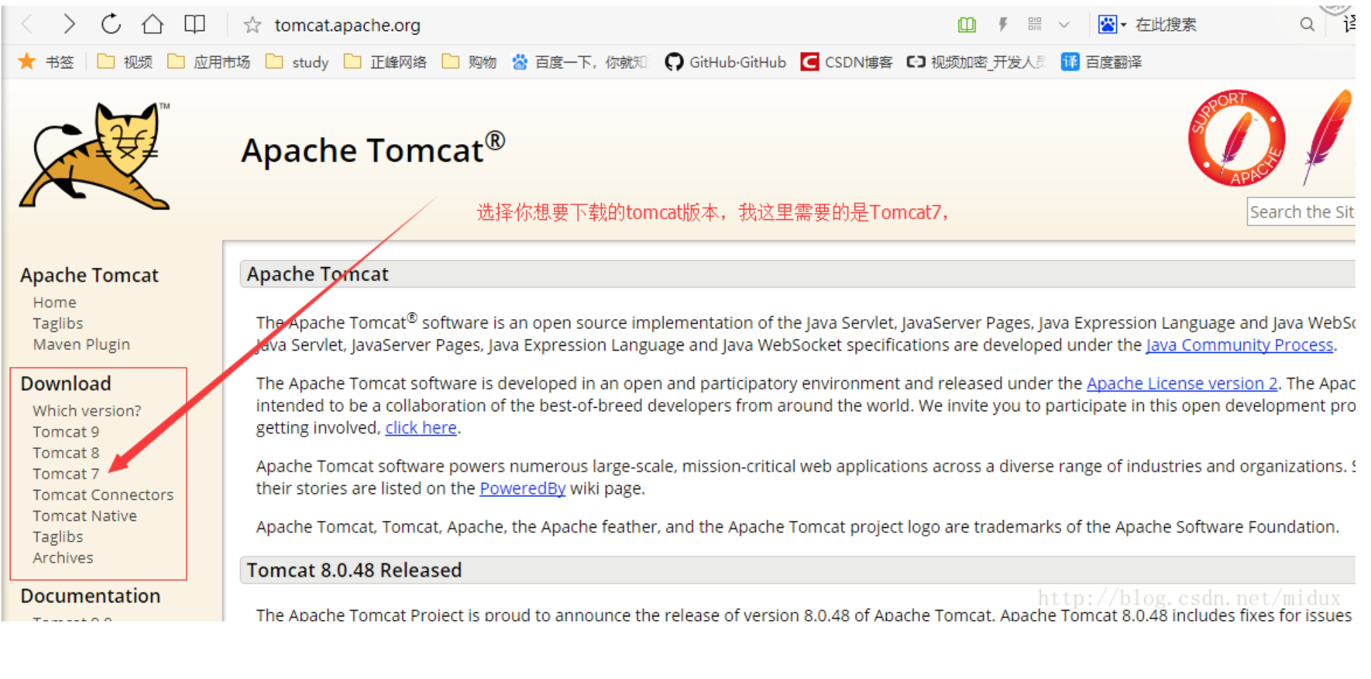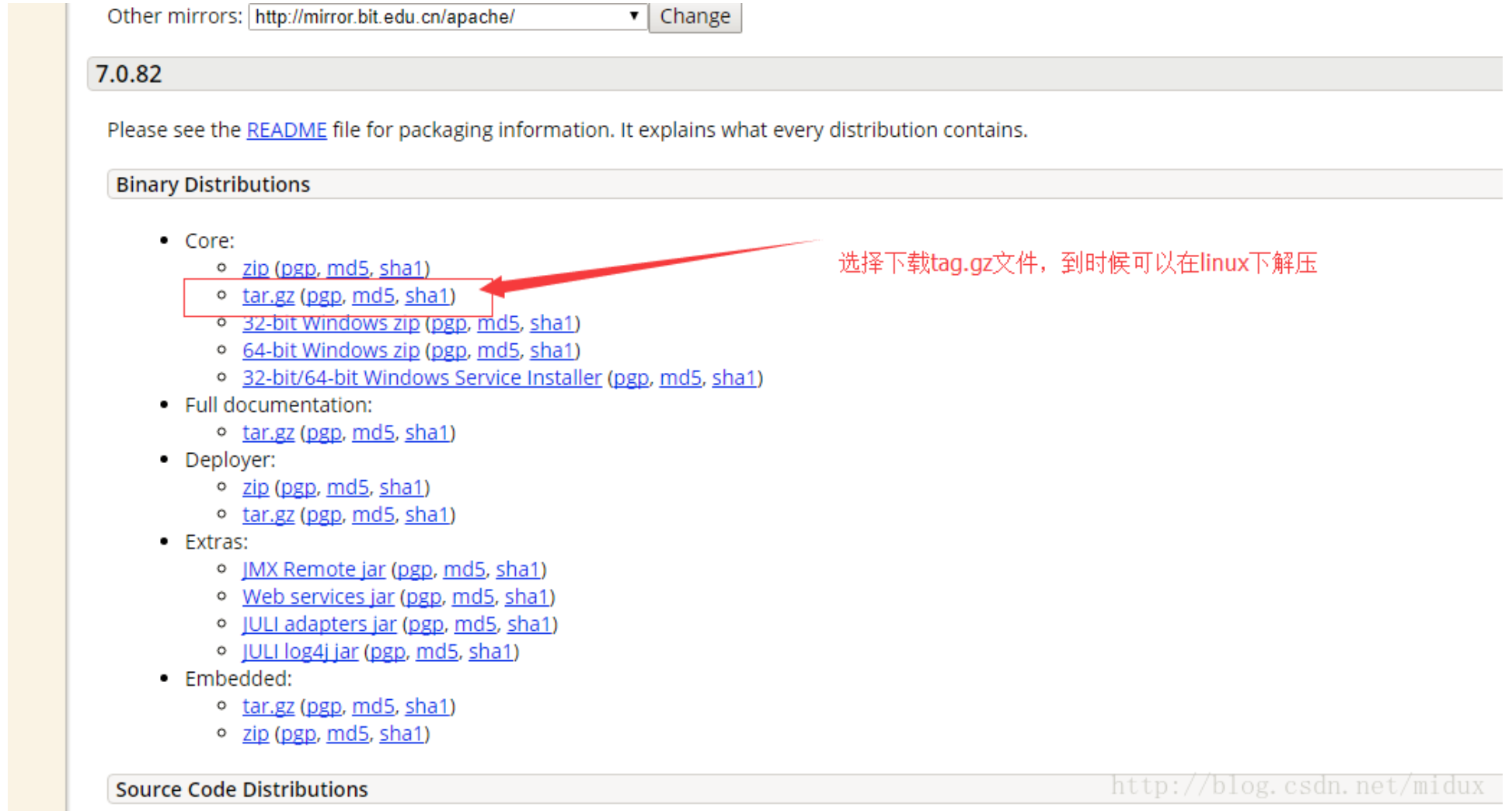 在tomcat官网下载自己想要的tomcat版本,这里我要的是tomcat7,然后进去之后下载tar.gz文件